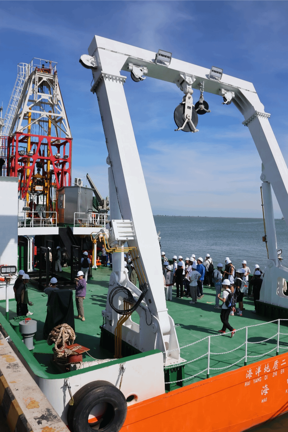 在海口海洋地质调查中心船舶大队队长陈亚东、“海洋地质二十六号”科考船大副匡载芳和工程师刘雨飞等工作人员的组织下,同学们有序入场。参观过程中,学生们认真听取了大副匡载芳对科考船的详细介绍,仔细观察了船上的指挥舱、仪器设备区等关键区域,对科考船的构造与功能有了直观的认识。讲解员表示:“同学们今天状态很好,求知热情高涨。”此次活动加深了学生对海洋科研活动的认知,开阔了视野,增强他们对海洋科学探索和研究的兴趣。