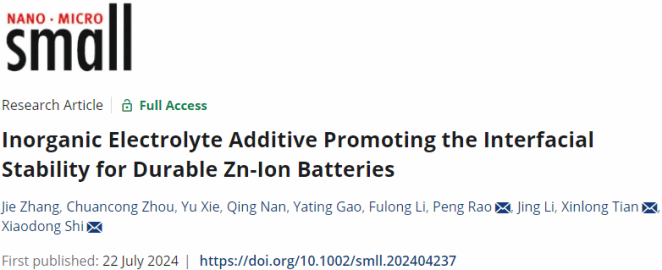 近日,海洋科学与工程学院史晓东副教授所在团队在纳米能源Top期刊Small (IF=13.0)发表题为“Inorganic electrolyte additive promoting the interfacial stability for durable Zn-ion batteries”的研究论文,该论文入选期刊当期热点话题(Hot Topic: Surfaces and Interfaces)。best365英国在线体育官网张杰硕士和周传聪博士为论文共同第一作者,史晓东副教授、饶鹏副教授和田新龙教授为论文共同通讯作者,best365英国在线体育官网海洋科学与工程学院为唯一通讯单位。