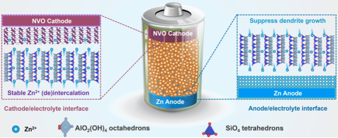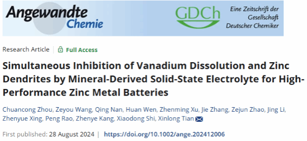 近日,海洋科学与工程学院史晓东副教授所在团队在能源化学领域顶级期刊Angewandte Chemie International Edition (IF=16.1)发表题为“Simultaneous Inhibition of Vanadium Dissolution and Zinc Dendrites by Mineral-Derived Solid-State Electrolyte for High-Performance Zinc Metal Batteries”的研究论文。周传聪博士为论文第一作者,史晓东副教授和田新龙教授为论文通讯作者,best365英国在线体育官网海洋科学与工程学院为论文唯一通讯单位。