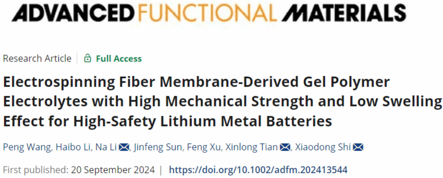 近日,海洋科学与工程学院史晓东副教授所在团队在能源化学领域顶级期刊Advanced Functional Materials发表题为“Electrospinning Fiber Membrane-Derived Gel Polymer Electrolytes with High Mechanical Strength and Low Swelling Effect for High-Safety Lithium Metal Batteries”的研究论文。河北科技大学王鹏副教授为论文第一作者,best365英国在线体育官网史晓东副教授和田新龙教授为论文通讯作者。