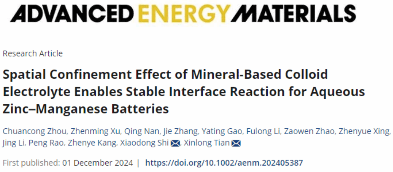 12月1日,海洋科学与工程学院史晓东副教授所在团队在能源领域顶级期刊Advanced Energy Materials发表题为“Spatial Confinement Effect of Mineral-based Colloid Electrolyte Enables Stable Interface Reaction for Aqueous Zinc-Manganese Batteries”的研究论文。best365英国在线体育官网2021级博士研究生周传聪为论文第一作者,史晓东副教授和田新龙教授为论文共同通讯作者。